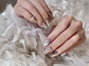 シルバーのクロスのジュエリーをイメージして、クロスのパーツにパールを合わせてアートをしました。