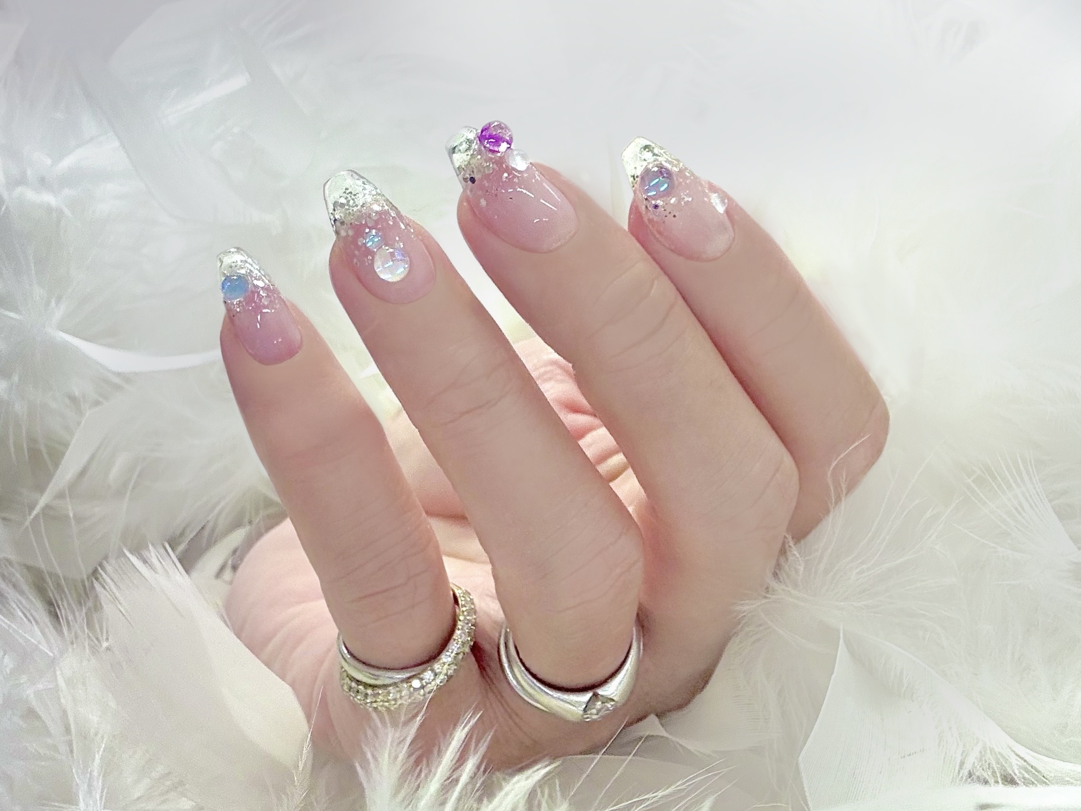 ベースが透け感のあるクリアなので、指先が軽やかで、これからの季節にもぴったりです。そこにシルバーラメをふんわりとのせ、さりげないきらめきをプラスしました。