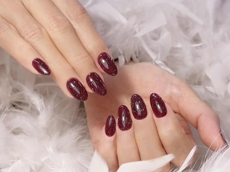 秋を先取りして、深みのある赤にフラッシュの輝きをプラスした大人ネイルをご紹介します。