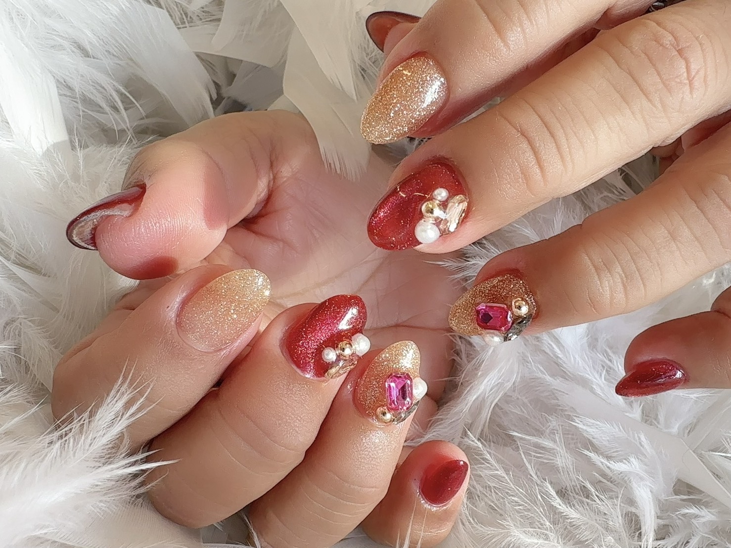 いつもとは少し雰囲気を変えて、今回はブラウン寄りの大人ボルドーをベースに、ゴールドのフラッシュネイルを組み合わせました。