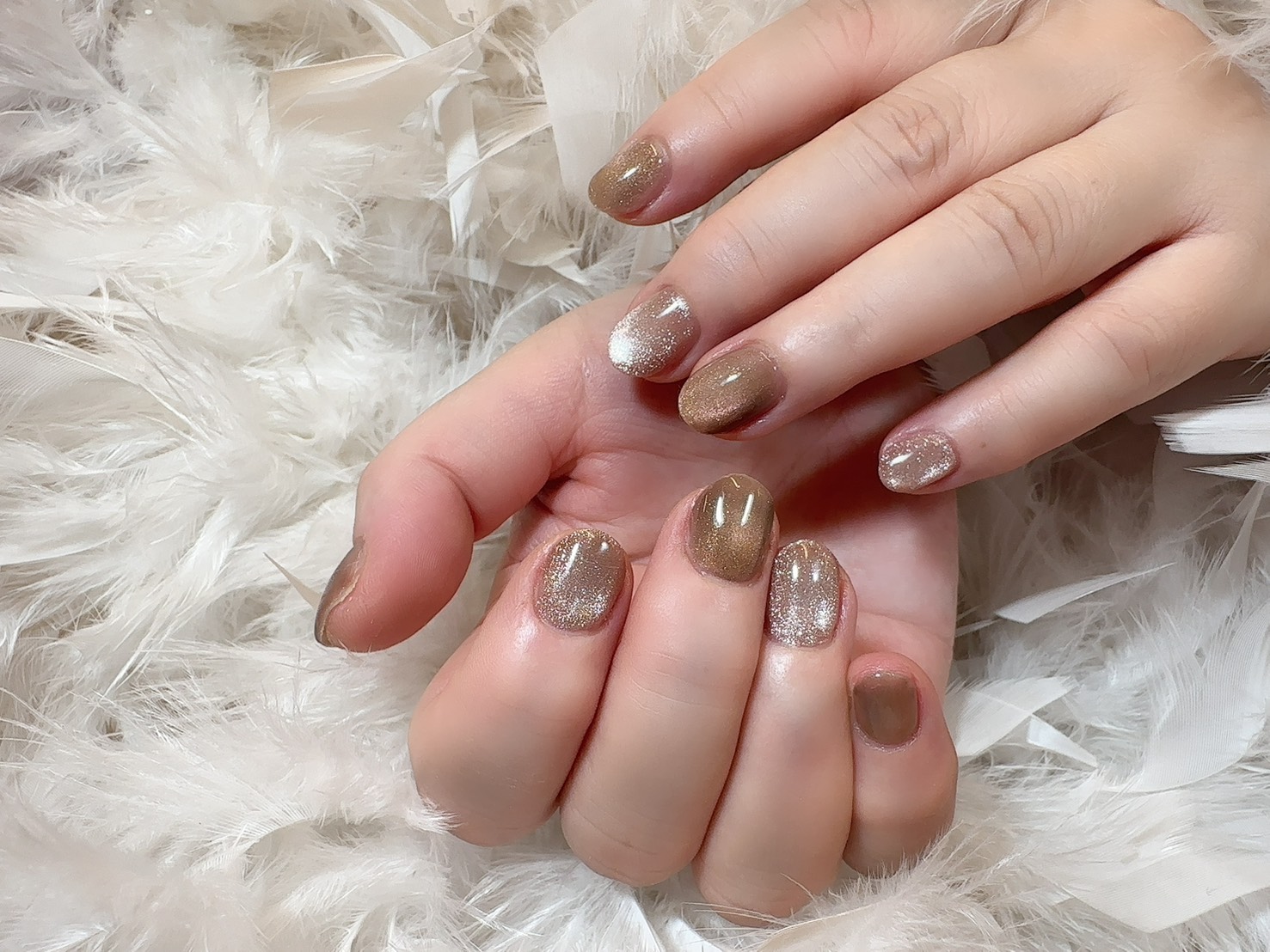 今回は、ストーンは使用せずベースカラーのみで仕上げていますが、マグネットネイルの輝きでシンプルながらも華やかなイメージに仕上がりました。