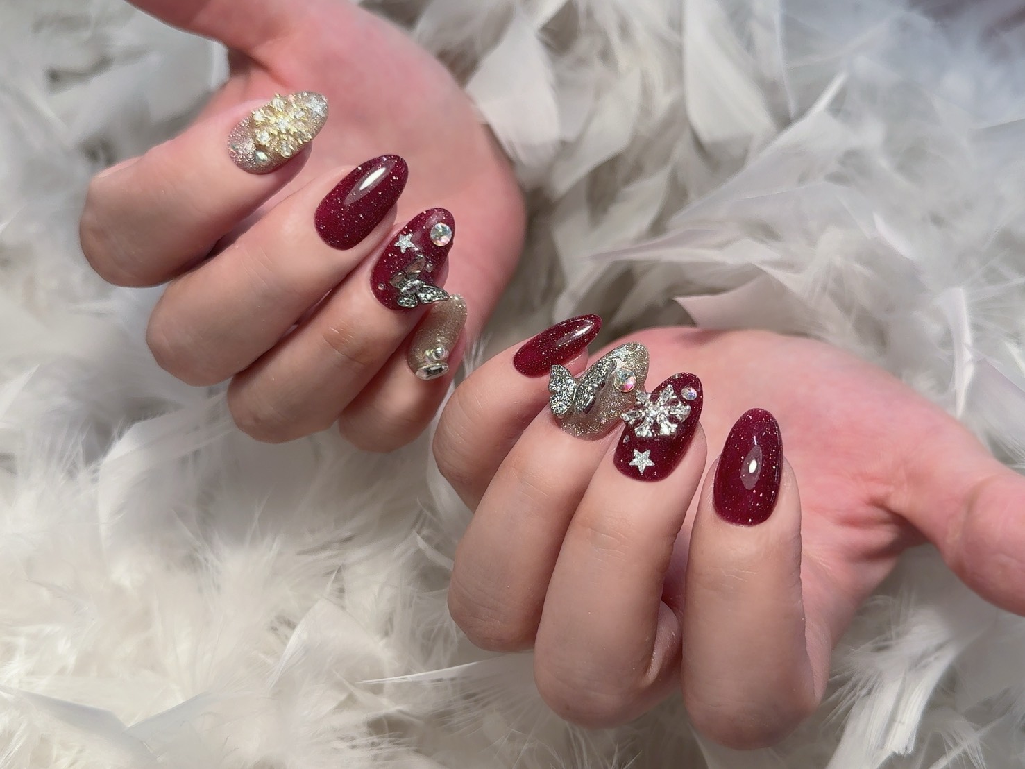ベースカラーは深みのあるボルドーで大人の華やかさを演出し、数本はシャンパンゴールドに近いラメで抜け感を出しています。