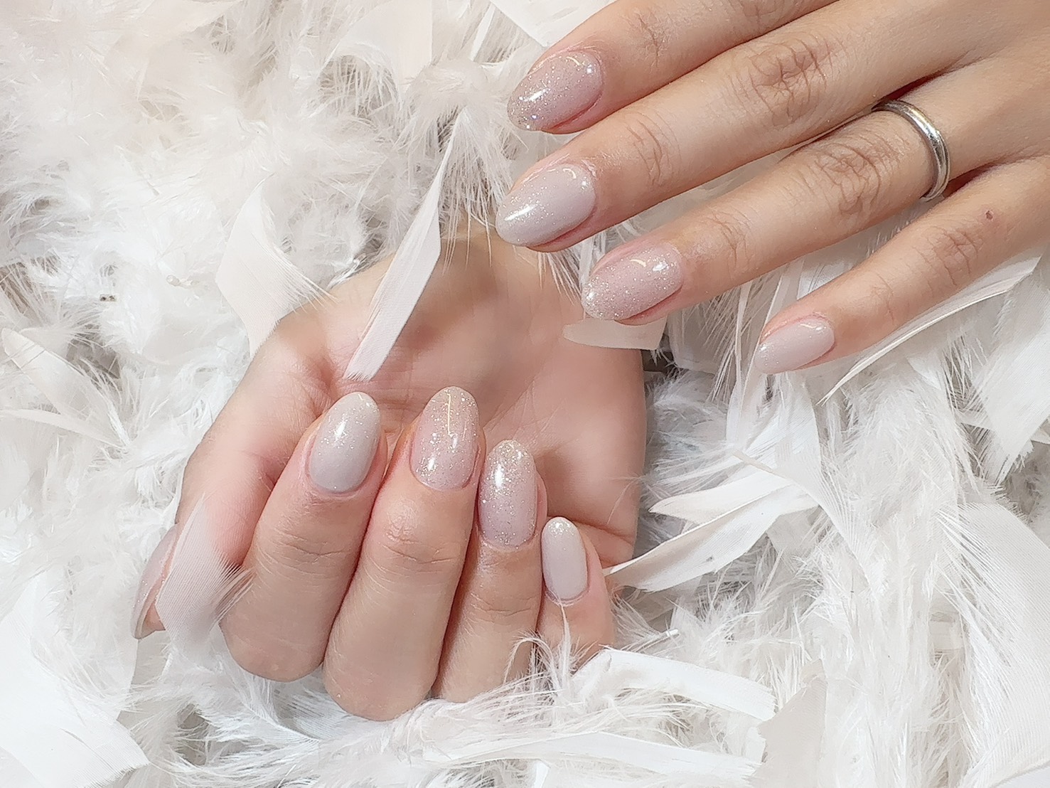 控えめな輝きに物足りなさを感じないよう、ポイントでフラッシュネイルを重ね、光が当たった瞬間にさりげなく存在感が出るデザインに仕上げました。