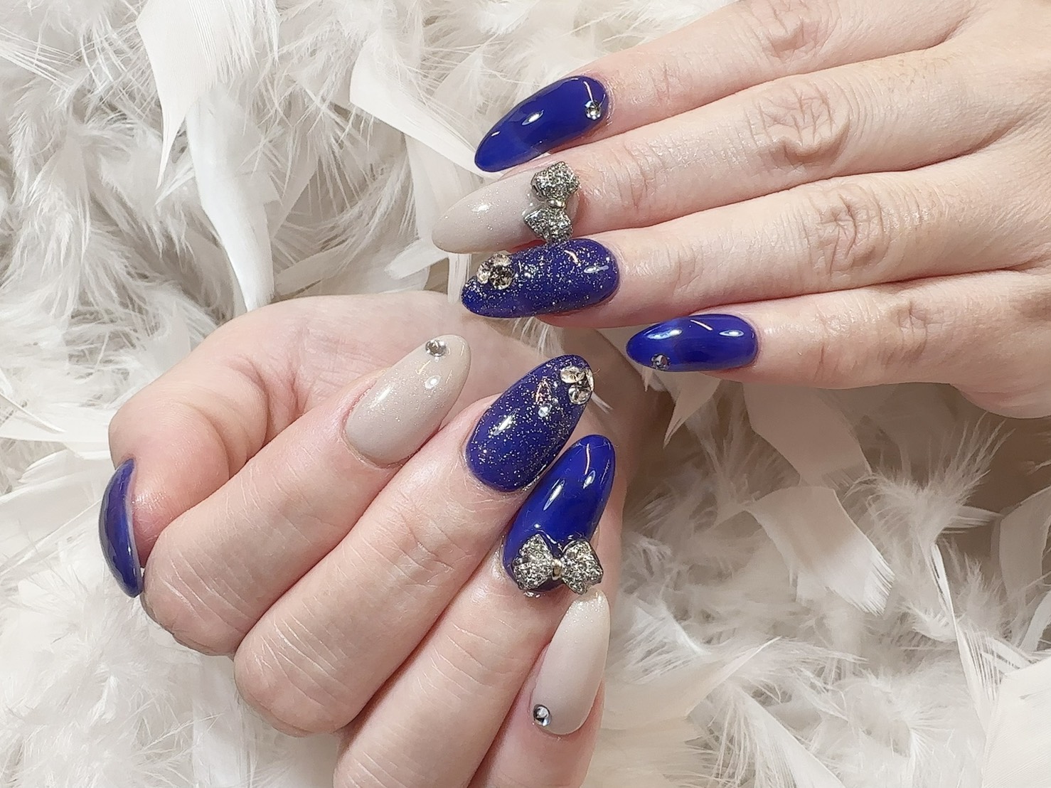 アクセントにはリボンパーツとクリスタルのストーンを添え、クールな配色の中に女性らしさをプラスしました。