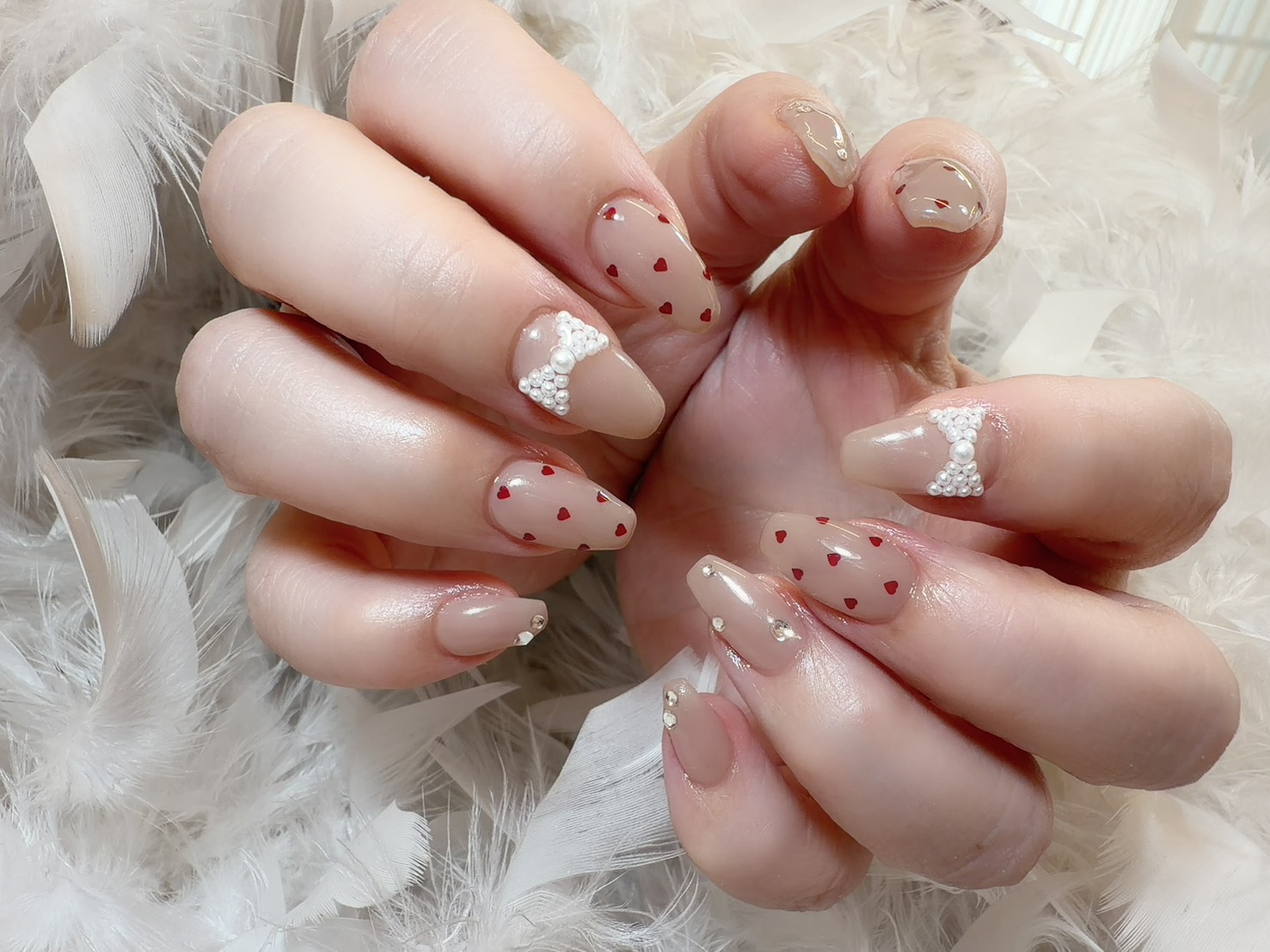 ベージュベースに白のハートをイメージされていましたが、あえて赤を選択しています。