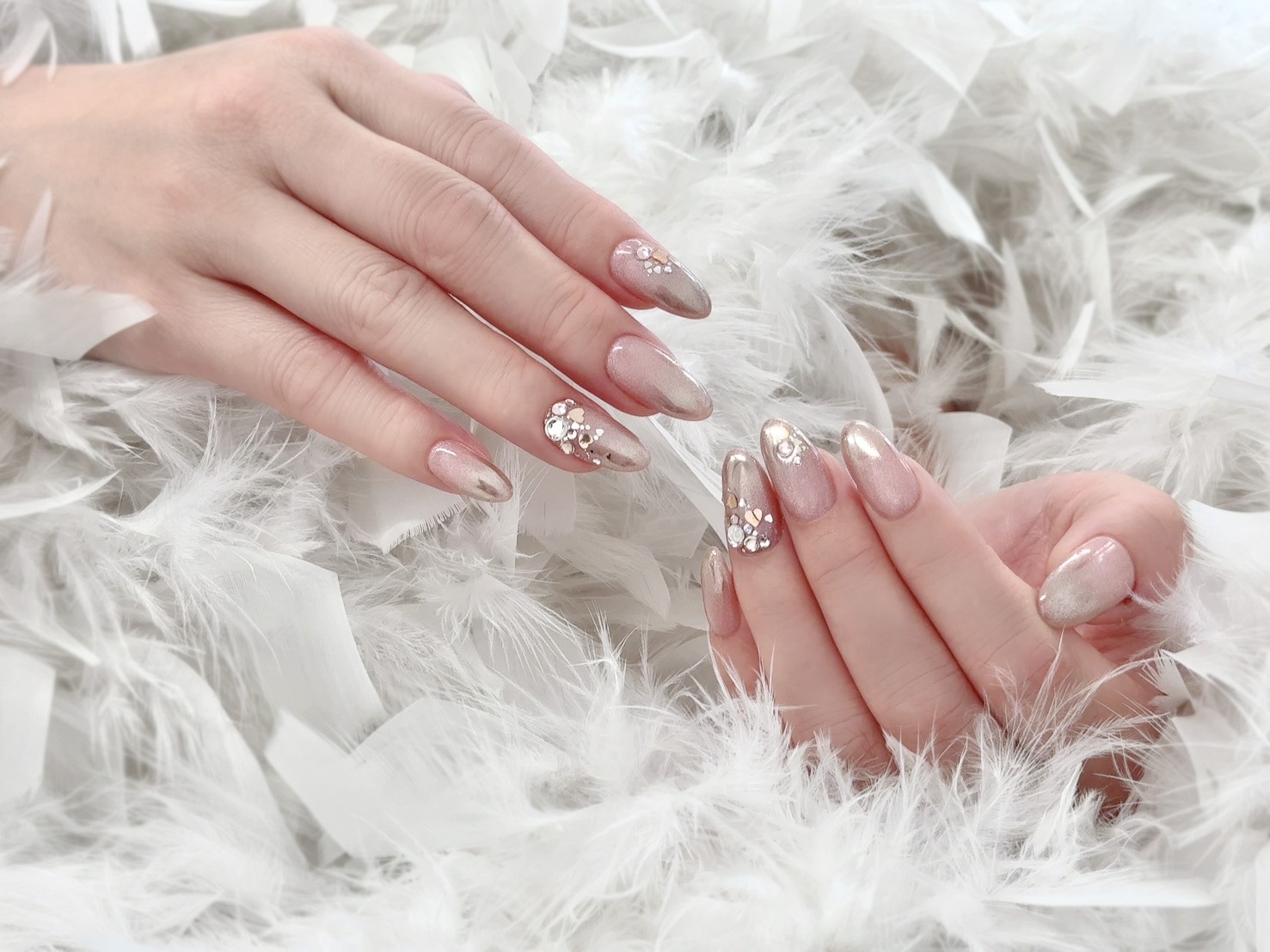 仕上げにはラインストーンと小さなハートのホロをあしらい、きらめきの中にさりげない可愛らしさを添えています。