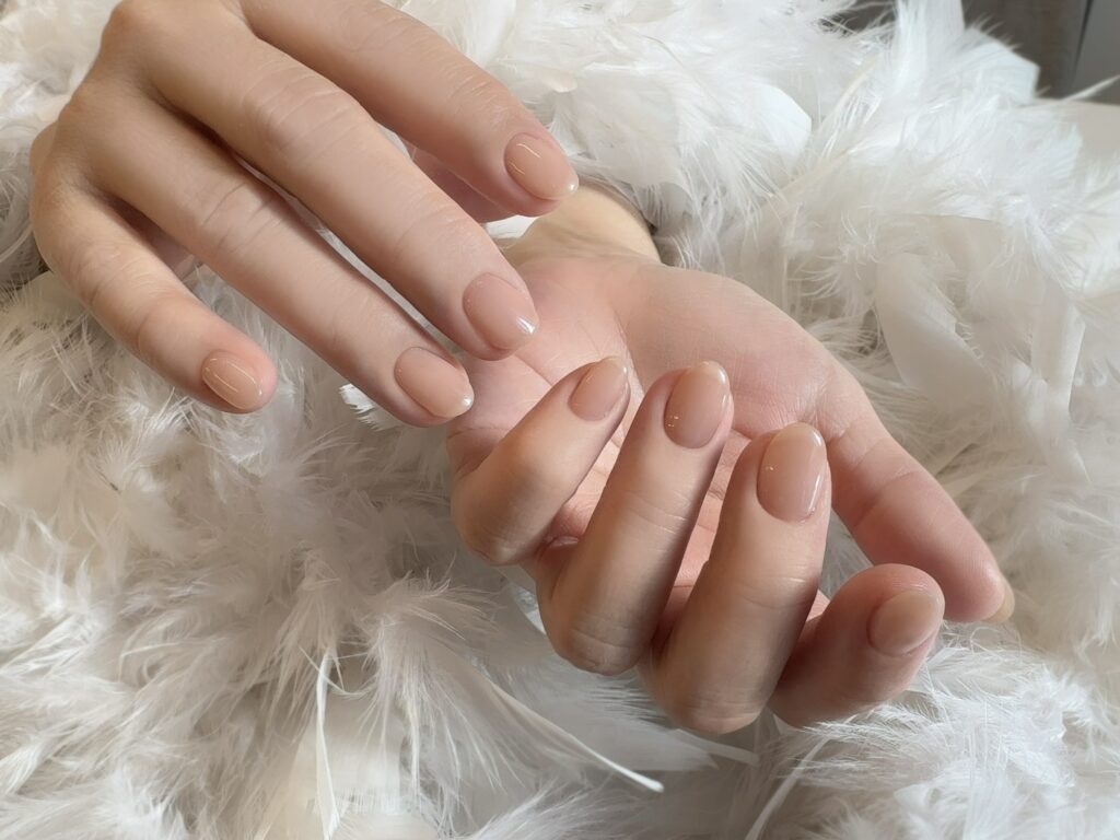 肌に溶け込むようなナチュラルベージュを纏った指先は、手肌の透明感を底上げし、洗練された品格を漂わせます。