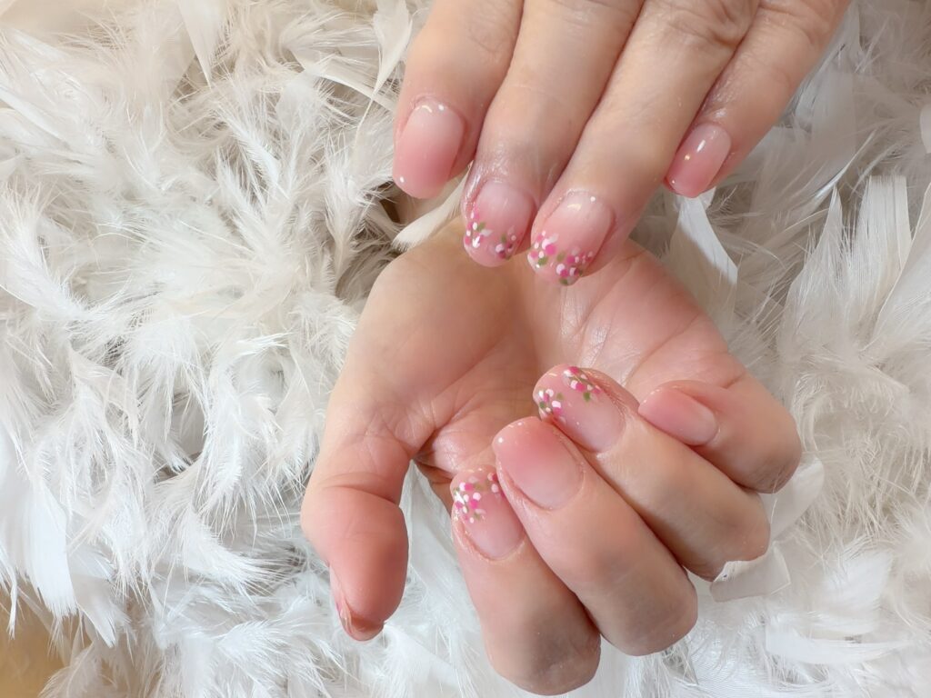 お手元を美しく引き立てる、優しいピンクのグラデーションに、繊細なドットで描いたフラワーアートを添えさせていただきました。