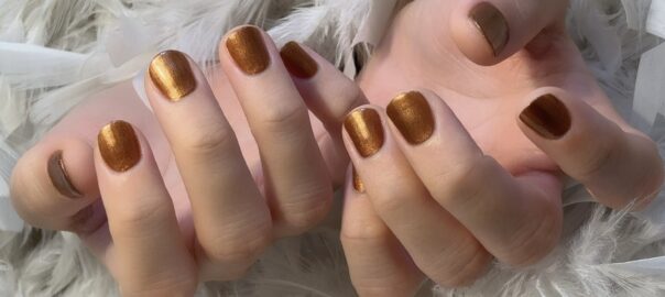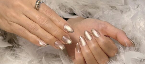 グレージュのマグネットネイルに、ゴールドの六角ホロを使ったナナメフレンチデザインのご紹介です。 新年らしく、輝きを主役にした上品な仕上がりです。 マグネット特有の奥行きある光に、幾何学的なホロを重ねることで、動きのある指 … 続きを読む 新年に煌めきを