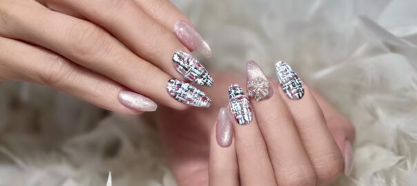 今回のデザインは、シュガーネイルの質感をベースにツイードを重ね、あえてザラつきを残すことでリアルな織り感を表現しました。 光の角度でシュガーがきらめき、繊細なニュアンスが立体的に浮き上がります。 ブラックとホワイトで描き … 続きを読む ツイードネイル