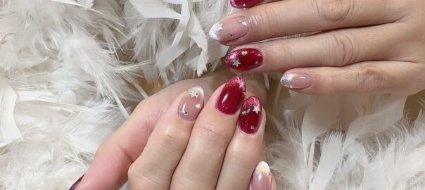 ピンクの上品なマグネットネイルをベースに、心ときめくクリスマスデザインをされたお客様のご紹介です。 マグネットの光は中心に集め、指先に奥行きと華やかさを演出しています。 リースとクリスマスツリーをそれぞれポイントに添え、 … 続きを読む ストーンでクリスマスネイル